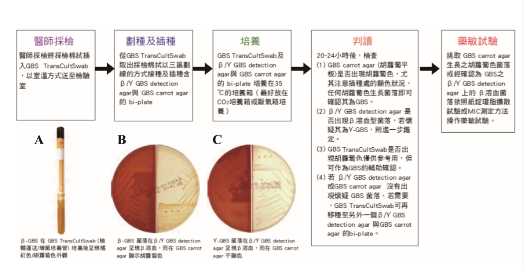TransCultSwab(GBS 的運(yùn)送增菌培養(yǎng) 管)[9]結(jié)合 / GBS detection agar(偵測瓊 脂)[10] / GBS