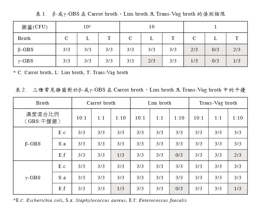 DetectTM會(huì)誘導(dǎo) 溶血型GBS呈現(xiàn) 溶血 型,將可提高 溶血型 GBS 偵測的靈敏度與 分離率[14-15]。 本研究比較目前GBS檢測常用的三種增 菌培養(yǎng)液(Carrot broth, Lim broth 及 TransVag broth)的效能,除了測試此三種增增菌培 養(yǎng)液的偵測極限,也與三種常見產(chǎn)道棲息菌 混合接種,以了解GBS在偵測中可能受到的 干擾。
