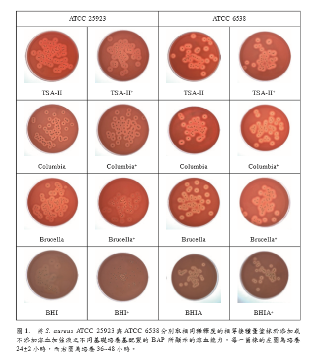食物中毒的主要致病原之一[1, 2]。中國大陸國 家標準金黃色葡萄球菌檢驗公告方法[3]建議 使用血瓊脂平板(BAP,以TSA或Columbia agar為基礎培養(yǎng)基)作為分離培養(yǎng)基。另外, 臨床微生物檢驗室常用TSA所配制的BAP接 種臨床檢體[4],以便初步識別不同溶血型式的分離菌。