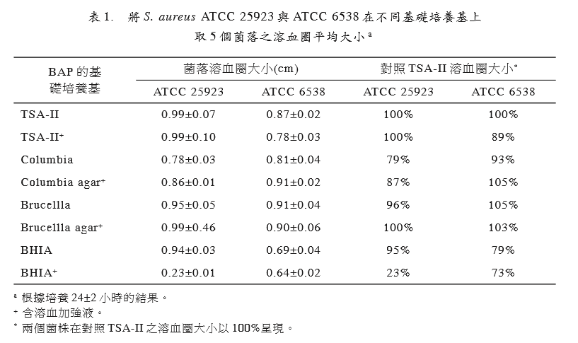 不具 -溶血型[10, 11]。有鑒于此,本研究以添 加與不添加溶血加強液至含不同基礎培養(yǎng)基 (TSA-II、Columbia agar、Brucella agar 與 BHIA)之BAP探討是否會對S. aureus ATCC 25923與 ATCC 6538溶血能力產(chǎn)生影響。